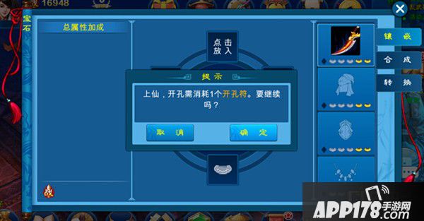宝石功能开启后,12个部位的第一个空位将会默认开启,之后每个位置的第2-4个孔位,每开一个孔都需要消耗指定数量的道具“开孔符”,”开孔符“商城有售,开孔成功后即可镶嵌宝石了。