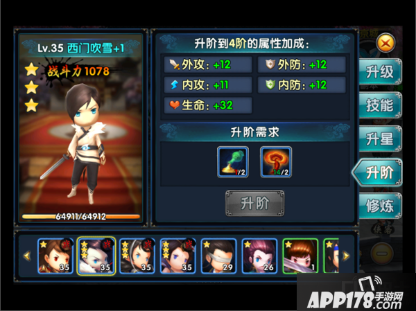 侠客升阶可通过消耗一定资源提升侠客的品质。
