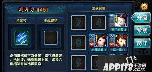 在阵型中可设置侠客站位、合体技能和出战宠物。