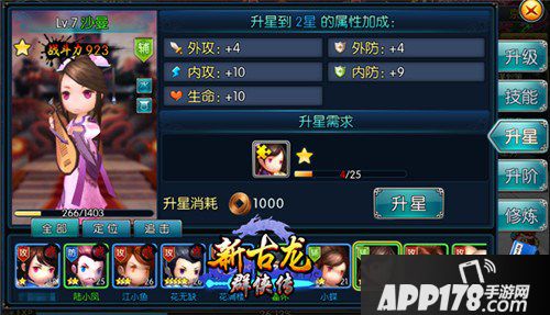 得到了众多女侠之后如何对她们进行“调教”呢?除了喂食小还丹或者大还丹让女侠快速升级之外,还需要带着女神多多通关侠客奇遇,获取更多的侠客碎片,当侠客碎片积攒到一定数量时,就可以升星。除此之外,还可以收集材料让女侠升阶、修炼等。不同的女侠组合在一起,还可以解锁不同的绝杀技能。