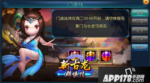 《新古龙群侠传》中玩家可以加入门派和小伙伴一起玩耍,在门派中除了可以学习门派技能,体验押镖众多新玩法,还可以在每周二、周四、周六的门派战中和小伙伴一起协力抗衡。活跃度达到200的门派可以在门派战会在8点准时开启。不过因为掌门人还要根据参加人员排兵布阵,所以最好早些进场等候掌门的排兵布阵。如果没有参与到战斗中,也不用泄气,因为在场外帮自己门派助威也可以获得大量奖励。