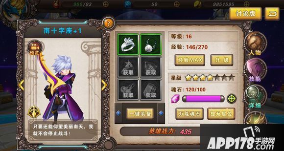 南十字座作为前排物理输出型英雄,虽然攻击不是特别暴力,但他层出不穷的各种buff各种控制却非常够看,全体输出buff,攻速buff,护甲buff,以及晕眩控制,绝对会让你的战斗更精彩。Buff的加持使他在强大的敌人面前也能从容不迫,勇敢面对,并且通过巧妙的利用buff取得最终的胜利。