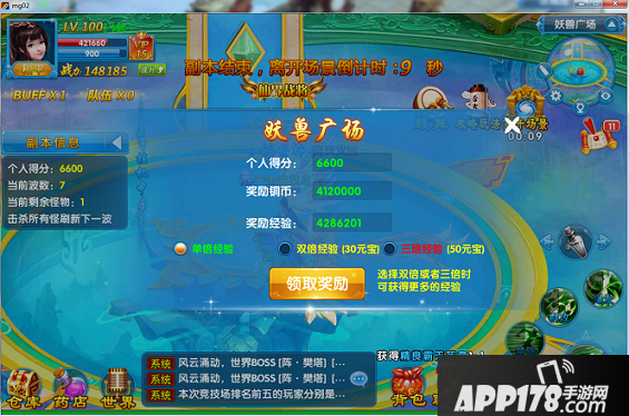 BOOS死亡活动结束,结束时会弹出结算界面,积分越高奖励越好,玩家也可以花费一定的元宝获得2倍、3倍的奖励。
