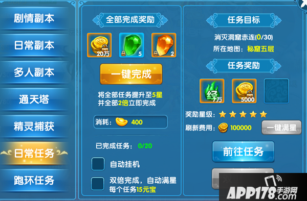 日常任务每天有20个,系统随机根据等级分配任务,完成进行下一个任务,日常跑环每天有100环,同样是系统根据等级随机分配,完成后可进行下一环任务,并且每10环有特殊奖励