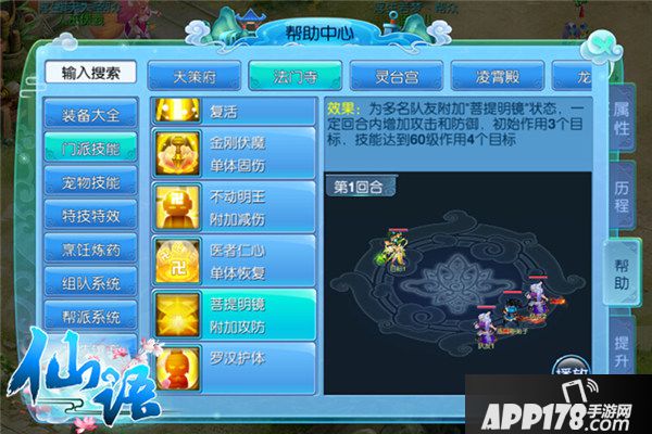 不仅输出系技能需要进化,辅助技能同样可以不断进化!《仙语》技能进化理论辅助系中最具代表性的是法门寺的菩提明镜,在战场上为多名队友附加增加攻击和防御的效果,初始作用3个目标,技能在60级时将进化为4个目标。