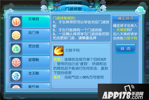 3.一旦确认拜师学习门派技能后即无法更换门派,请慎重选择哦。