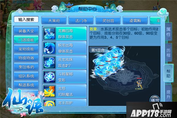 远程法术输出是战场上最可怕的存在,《仙语》技能进化理论法术系最具代表的技能便是龙王殿的龙腾四海,水系法术攻击多个目标,初始作用2个目标,在30、60、90级时进化为3、4、5个目标!群体法术永不过时,不断进化才是王道。