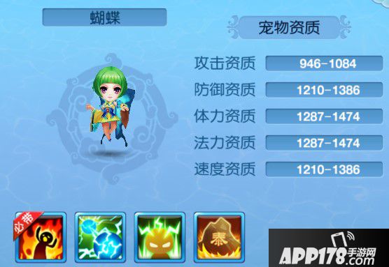 最后一只是法宠蝴蝶,作为又一只常被新手忽略的宠物,也常常拿这只宠物和45级的瑞兽做对比。个人认为蝴蝶宠物整体稍优于45级的法宠瑞兽。蝴蝶本身自带技能火系弱点,法连,感知,灵山重击。法连的存在降低了蝴蝶培养的成本,整体的资质属性也不错,评分在A+级。