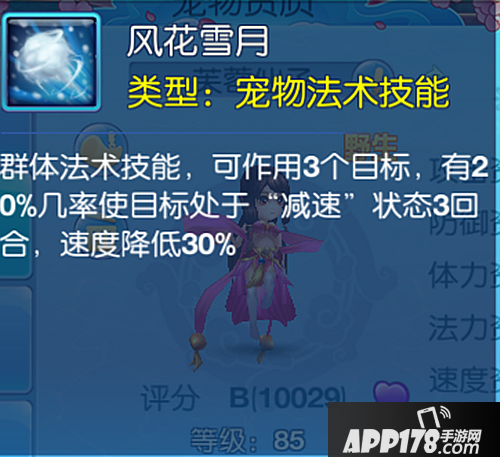 首先值得一提的是85级宠物独有的特殊技能,芙蓉仙子才可携带的:风花雪月,技能效果是20%几率使目标处于“减速”状态3回合,速度将会降低30%。虽然说和普通的群法没啥区别,但在比武或者帮战中,要是遇上对面的芙蓉成功减速影响出手速度,尤其是控对面封系和物理的速度,对整体战局影响还是蛮大的。所以升到85的小伙伴赶紧练一个吧!