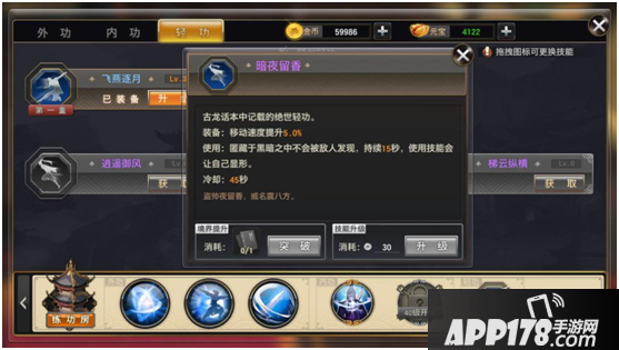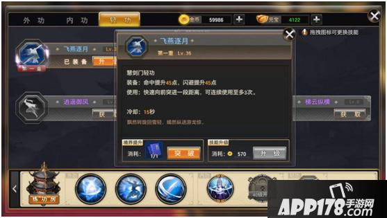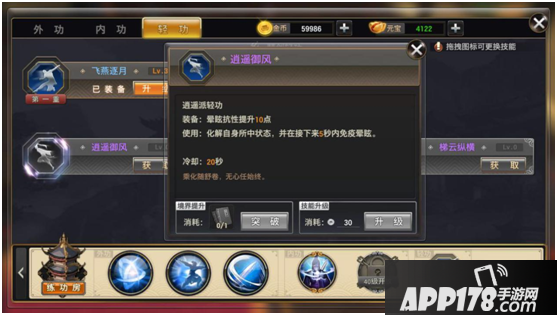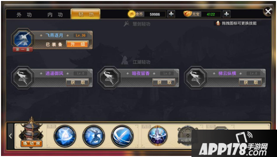 第二部分(江湖轻功)通过使用对应武学秘籍提升境界,使用金币提升技能。