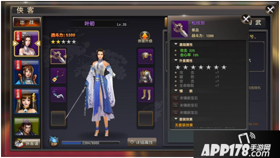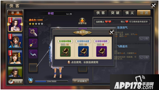 侠客升级,可以使用古龙话本进行升级。[图片]侠客装备:每一个侠客可以穿戴武器,防具,一共6件。可以通过强化,镶嵌宝石,升星。来对装备进行提升。