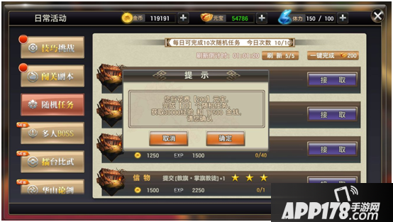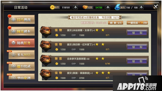 随机任务刷新时间1小时,刷新次数共5次(任务有星级,星级越高奖励越好),每日可完成10次随机任务。