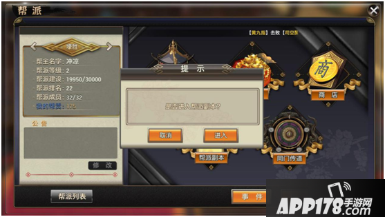 点击帮派副本,出现提示进入副本,建议组队哦,单刷难度还是有点高的。成功通关后会获得大量奖励,快来体验吧,叫上你的小伙伴,一起闯荡江湖!