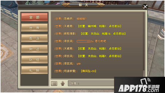 聊天系统:左侧是频道选择。目前有6个频道,分别为世界,帮派,附近,队伍,私聊和全部。(全部,这个选项是包括5个频道的所有集中在一起的一个频道。)可以打字也可以语音哦。