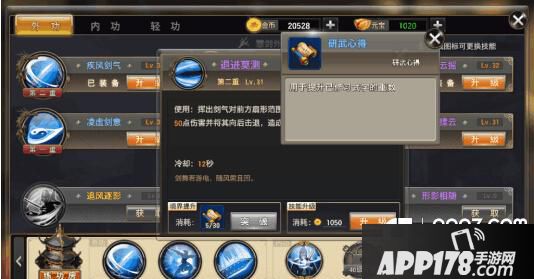 技能升级不仅对整体的战斗力有作用,而且在实际战斗中的作用更大,技能的升级只需要金币,技能的等级不能超过人物的等级,不过技能可以加强到多重,通过得到研武心得升到第二重,加强技能攻击力。