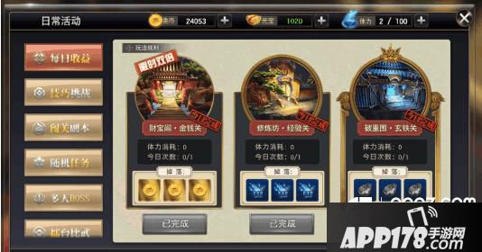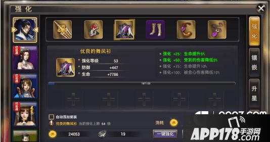 每个人物身上都有6件装备,首先我们可以通过闯关将这6件装备刷成金色装备,因为升级金色装备的战斗力提升很大,当然我们也不能只升级人物而忽略侠客的装备,如果有体力不要浪费,有就拿来扫荡,一阶金色装备只要20个碎片,全部刷成金色一点也不难,花时间每天扫荡或闯关即可,强化达到指定的等级还有额外的属性加成,所以一点体力也不要浪费,升级还需要两样东西,玄铁和金币,玄铁可以通过每日收益和闯关得到,多闯关总没错,再次强调,全部把装备刷成金色对战斗力提升非常大。