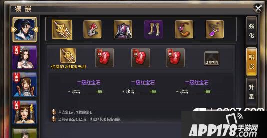 镶嵌宝石对于战斗力的升级也非常大,宝石有红宝石,蓝宝石,黄宝石等等,等级最高四级,因为每个装备只能放三个宝石,当然对应的装备有对应颜色的宝石,因为只有三个位置,所以如果放1级宝石就太浪费位置了,建议至少放二级宝石,宝石等级越高,作用越大,战斗力越高。那么重点来了,宝石应该怎么得到?可以通过闯关副本,元宝商城和闯关商店得到,最容易得到还是闯关副本,基本一轮下来可以得到至少10个不同颜色的一级宝石,三个一级宝石就可以合成一个二级宝石,当你把所有装备都装上二级宝石,战斗力的提升就非常恐怖了。
