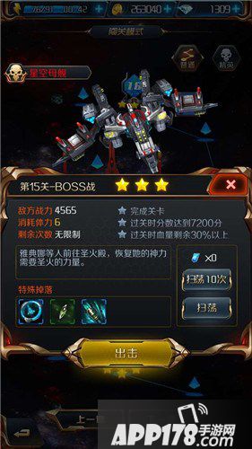 此关BOSS星空母舰,战力4565,无属性。三星通关的要求比较简单,7200分以及通关时血量剩余30%以上。