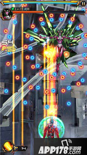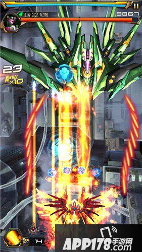 进入BOSS之前基本没什么难点。此关BOSS第一形态的炮弹唯一需要注意的是两侧红色射线炮弹发射的同时,中间会有蓝色的光球炮弹射出,需要左右移动在不碰到红色射线炮弹的同时避开蓝色光球炮弹。如果副炮使用的是钢铁守卫,这里问题就不怎么大了,基本都可以被钢铁守卫的屏障抵消掉。