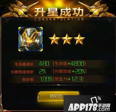 除了解锁之外,零件还可以对机甲或装备进行升级。当零件数量达到要求之后,便可以通过各机甲或装备强化系列里面的升星来为机甲升级,升星可以大幅度增加机甲的属性成长值,也就升一级所提升的属性数,是所有战斗力升级系统中一次性提升最高的系统,但是升一次星所需的零件有很多,需要玩家通过长时间收集才能获得足够的零件,这也是40~50级的期间玩家主要目标之一。