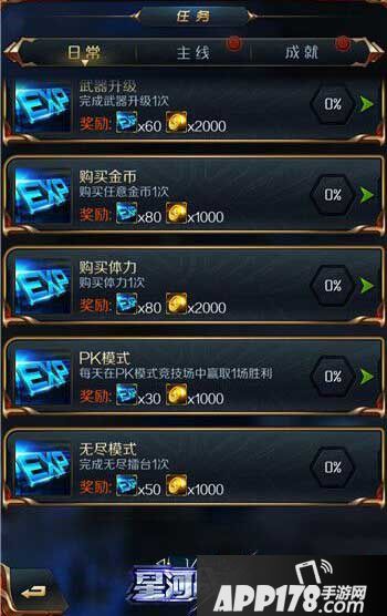 在《星河战神》的任务栏中有很多日常、主线任务,玩家完成任务即可获取相应的金币奖励。这些任务大多数难度很低,只有为数不多的几个任务需要玩家稍费心思。一般来说,完成一次武器升级、购买一次体力等任务对于玩家来说只是动动手指的事情,玩家再也不必担心花费自己宝贵的时间来赚金币了!