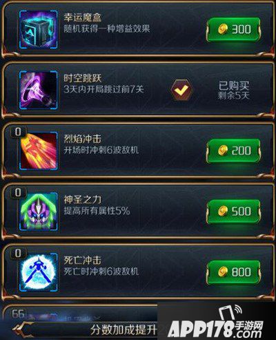 BUFF类:双倍金币、三倍金币、开局获得能量护盾、开局获得暴走、分数加成提升15%、分数加成提升20%、出场时突破8波敌机、所有属性加成10%、死亡时突破8波敌机。