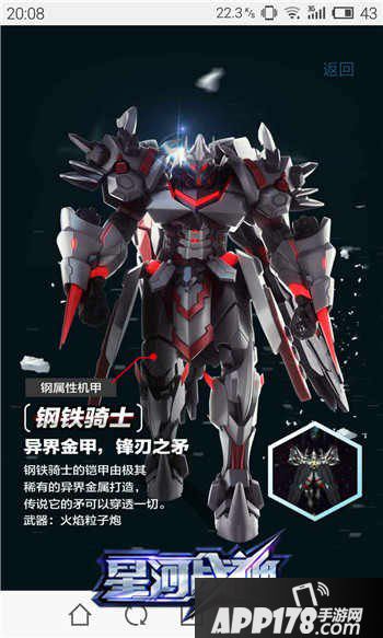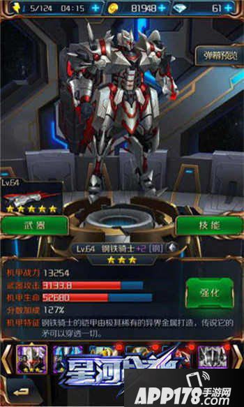 星河战神钢铁战神怎么样?钢铁战神后期培养心得!对于绝大多数玩家来说,在《星河战神》中已经到达了机甲培养的后期阶段,王者争霸也随之上演了。在六个属性不同的机甲中,钢铁骑士作为王牌机甲之一,其酷炫的外表充满着金属质感,而银灰色的机身镶嵌着红色的纹理,金属特有的光芒闪耀其中。更值得一提的是,它无与伦比的钢铁之矛是最让敌人闻风丧胆的特征。钢铁骑士作为钢属性机甲,可在石属性的BOSS关卡中提升30%的战力,更让机甲无人能敌。今天,小编为大家讲解下钢铁骑士的后期培养攻略。