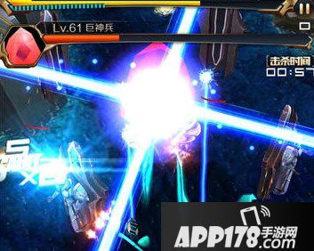 和简单难度不同的是,普通难度的BOSS激光释放不再是向三个方向同时释放,而是左右呈180°角释放。激光炮的数量也从3个增加到了6个。外层是4个,里层是2个。外层4个打爆之后就会掉落火力升级的道具。但是作为一个提倡简单粗暴的玩家,小神我一般都不会去管这些激光炮。有时候宁愿使用机甲必杀,也要在最快的速度结束了战斗。但是机甲必杀用来击杀巨神兵BOSS的时候可能不会秒杀,只能消耗一半的血,所以玩家可以先消耗巨神兵BOSS一半的血再使用机甲必杀。
