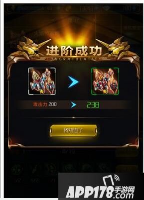 进入到装备中,点击想要装备的强化按钮,进入到装备的详细界面中,我们可以在右下角看到进阶按钮,点击便会显示出改装备进阶前和进阶后的属性对比,当然材料不足时并不会显示,只会提示材料不足!