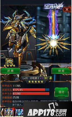 在星河战神的游戏中,玩家们一共可以获得六件机甲,分别是水属性的寒冰刺客、石属性的沙暴领主、火属性的火焰将军、雷属性的闪电爵士、风属性的暴风女妖以及钢属性的钢铁骑士,六大机甲能帮助玩家应对各种挑战。而玩家升级机甲就能让自己的战力获得飙升。升级材料的来源途径有很多,寻宝、活动、签到、任务、闯关模式等均可以获得升级材料,升级材料经验球也分为四种品质,品质越高机甲获得的经验越多,机甲战力也在升级之后获得质的改变。