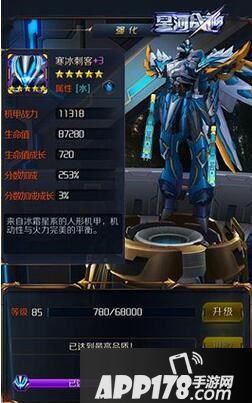 玩家可以通过升级、进阶、升星等途径消耗指定材料让机甲获得成长。升级机甲需要消耗经验球;进阶则能提升机甲的品质,现阶段最高品质为紫色。进阶需要消耗的各色材料都能通过闯关获得;升星顾名思义可以提升机甲的星级,从最初的1星,成长为5星,能够百分比增加机甲属性。机甲升星需要消耗一定数量的机甲零件,之前解锁机甲剩余的零件在这里发挥了作用,零件通过挑战制定精英难度的BOSS战就有概率掉落获得。