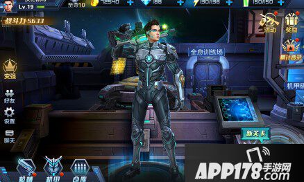 在两侧分别为变强,好友,设置,聊天,另一边为活动,奖励,累计登录,机甲研究所!