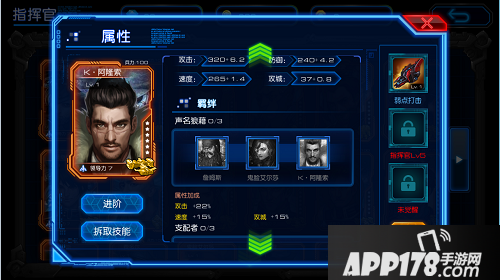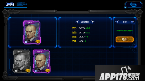 游戏中可通过消耗一张相同的指挥官卡来进阶该指挥官属性,并且1颗星变为金色。如果材料卡为已经进阶过的卡牌,则在增加属性以及金色星星数量按照材料卡对应数量进行累加,超出上限部分不再累加。