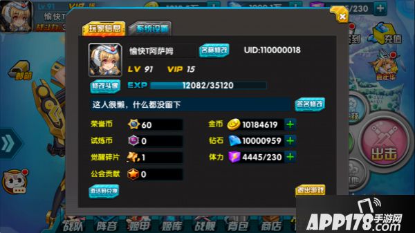 玩家信息界面有关于玩家的详细信息,头像的更换,名称修改,ID号,等级,VIP等级,经验签名等等。