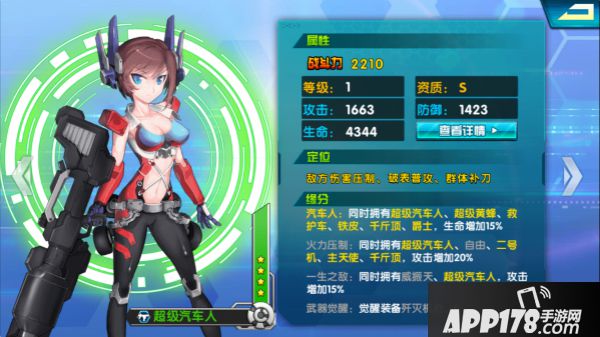 S资质的超强汽车人拥有超级领导模块的领袖级姬娘,对姬娘都有控场的功效,一般来说,战队带着女神,绝逼杠杠的。尤其是在对敌人的武装武力压制上,不但降低了对手的攻击,而且强悍的群体攻击可以瞬息让地方姬娘瓦解。