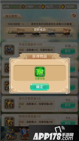 由于主角等级会直接制约伙伴等级的提升,所以提神主角等级也是一个必须的过程。刷副本是很多玩家获得经验的主要途径,值得一提的是主界面的悬赏。悬赏任务每日更新,且随着你等级的提升,任务数量会增加,完成每日悬赏任务最高可获得6800经验值,对于主角升级简直是完美途径。并且,完成任务还会获得活跃度,收集活跃度可以领取宝箱,宝箱内有大量的资源哟。