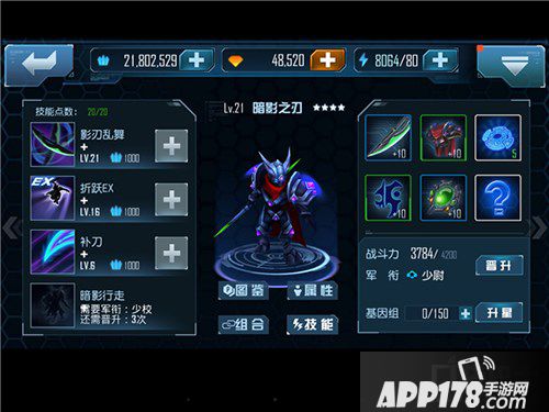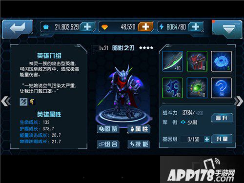 暗影之刃的初始生命值只有342,但初始护盾值高达982,拥有游戏最高的初始能量攻击强度和最高能量攻击成长值,制霸着整个游戏。配合他强力的刺杀能力,在敌方后排输出着成吨的能量伤害,是一个可怕的能量刺客。