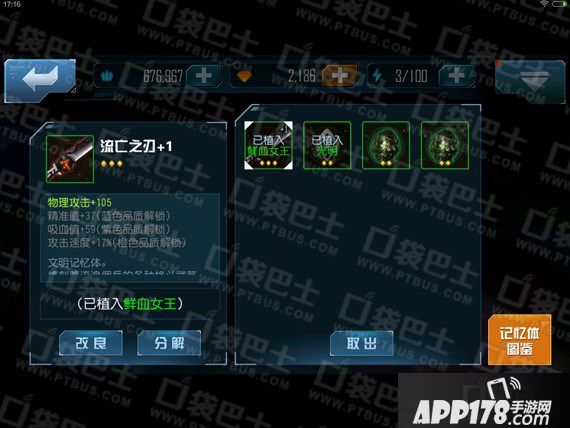 记忆体自身拥有一定的属性,也可以和普通装备一样升级进化。不同类型的记忆体可以提供不同类型的属性,比如物理攻击者(PA)的常用记忆体为流亡之刃,装备升满以后可以提供物理攻击力、精准值、吸血值和攻击速度四项属性。所以让对应属性的英雄装备合适的记忆体可以让英雄发挥更强的力量。