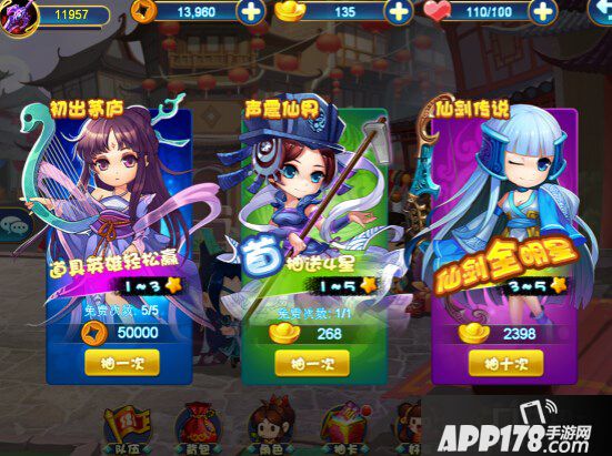 游戏中抽卡分为初出茅庐、声震仙界、仙剑传说三个等次。