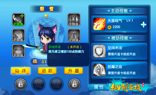 主动回血技能在近战职业中实属少有,而光环技能由能够提升同职业的攻防属性,尤其是“妖魔之血”可提升300点的攻击力,这也弥补了虎卫攻击输出先天不足的缺点,此外后期队伍中加入强力角色后可以将思堂放入替补阵容中做专职的光环Buff角色。