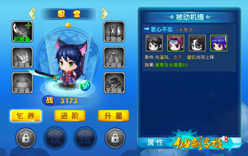 衷心不忘:与溪风、血手、璇玑共同上阵提高6%攻击速度(被动机缘技能);