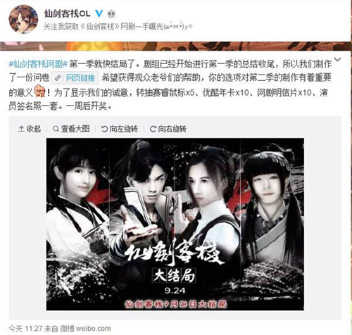 剧组已经开始进行第一季的总结收尾,也因此制作了一份问卷,点击阅读原文即可填写,希望广大观众能抽出一点宝贵的时间来填写,你的选项对第二季的制作有着重要的意义!网剧官方微博@仙剑客栈OL 在新浪微博开展了转发问卷微博抽奖活动,转发微博就有机会获得赛睿鼠标、演员签名照、优酷年卡,网剧明信片。
