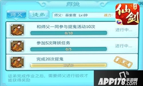 玩家拜师后,作为徒弟每日都会有师徒作业。需要注意的是,出现与师父共同副本或共同捉鬼的时候,先不要与师父一起去做,先跟着车夫等有经验加成的完成后再跟着师父重复去做,完成师徒作业后会获得经验果和装备强化材料。为了迅速出师,经验果的经验也是至关重要的。