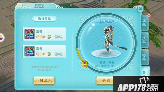 稀有雷兽A+超凡峰龟A(还是45级时合成的)=超凡魁召S(自带高等技能风卷尘生)