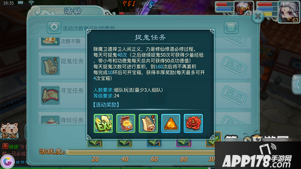 ①捉鬼:24级开启的捉鬼日常可以为我们提供大量的功德。每天可捉鬼90次,后50次捉鬼可以给我们提供不少的功德。当然了,等级高的玩家可以带低于自己10级的玩家,这样,在每天的前40次捉鬼时,不仅可以获得经验,也可以获得功德。