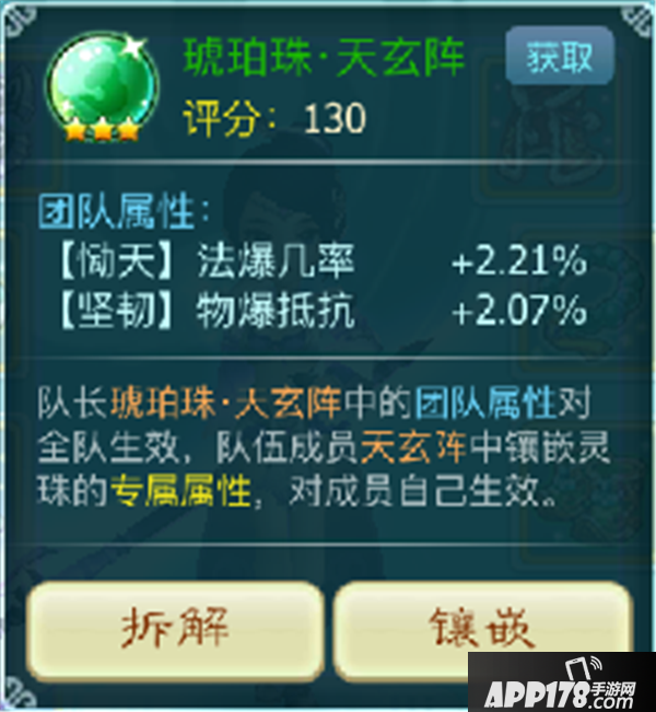 获得未鉴定琥珀珠进行鉴定,将会获得对应阵法的灵珠,琥珀珠的星级不同加成的数值也不同,相同阵法的琥珀珠所拥有的团队属性也并不是固定的,丰富了阵法搭配的多样性。