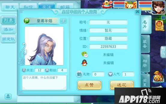 个人空间分为四个部分,名片、装备、相册、关系网,其中,名片可以查看人物的各类信息,还可以点赞增加人气。