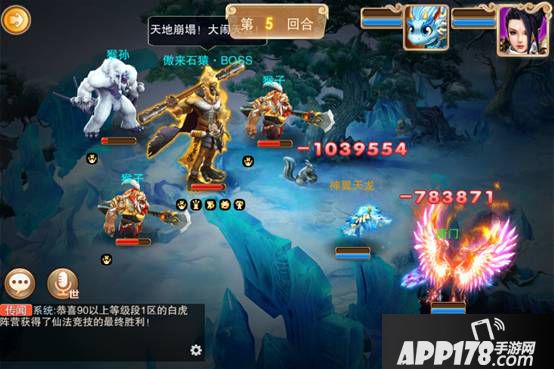 如果中了嘲讽技能,接下来的三个回合我们只能对猴孙进行普通攻击了,而此时猴王的血量必然还在90%以上,那么在第五回合到来后猴王就要大闹天宫了,我们来看看猴王大闹天宫的威力。