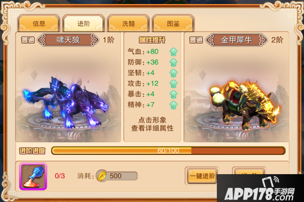 坐骑可以通过喂养和进阶的方式来提升属性,坐骑进阶以后还可以获得新的更霸气的外观,够拉风吧~
