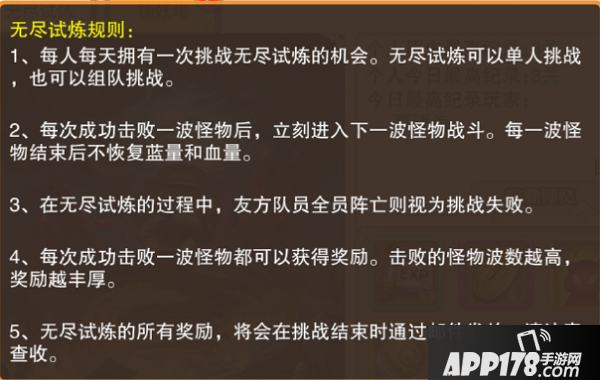 无尽试炼是组队挑战玩法,玩家通过不断击杀怪物获得奖励,成功击杀怪物的波数越高,奖励越丰厚!